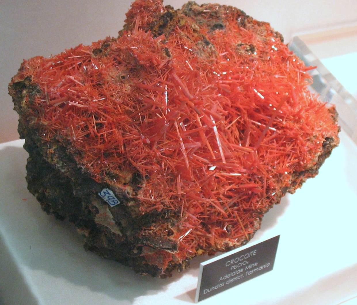 Crocoite, a brilliant orange-red lead chromate mineral, and very rare, except at a particular mine or cluster of mines in Tasmania. The crystals are a bit fragile, just like they look, and must be collected with care, then etched from the matrix with chemicals. |