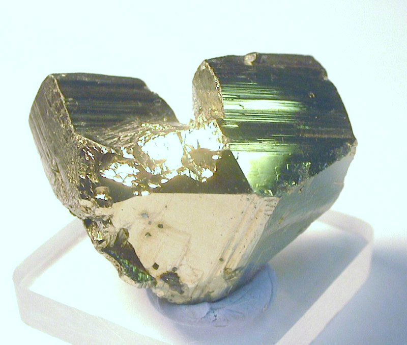 Pyrite from the old Gilman Mine, north of Leadville, came out in large quantities while the mine operated. It ceased operations around 1980. Still many old specimens abound in Colorado collections. This specimen shows an unusual habit of some, with two crystals forming into one at one end. Pyrite can form perfect cubes, octahedrons, pyritohedrons (they look kind of like soccer balls), or a complex combination of several. Spomer collection. |