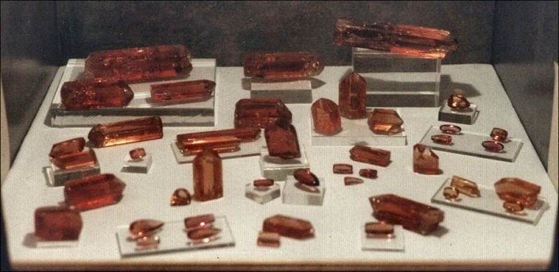 The finest display of gem Imperial topaz from Ouro Preto, Minas Gerais, Brazil I have ever seen. This was on display a few years back at Tucson. The golden color is permanent and does not fade. It is presumably caused by iron content. The pinkish color is due to chromium. Imperial topaz can sometimes be "pinked" using heat from a kiln or oven. Flawless, clean crystals such as this are quite rare, and usually get cut into valuable gemstones quickly. Topaz as a gem comes in colorless, blue, champagne, sherry, green, pink, red, and gold. Champagne and sherry topazes are not color stable and will fade in the sun, either quickly or over time. Ouro Preto is almost an exclusive area of origination for the pinkish-gold color-stable variety known as Imperial, or "precious topaz". |