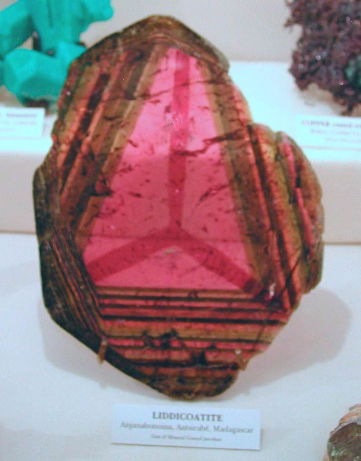 A large polished slab of zoned watermelon liddicoatite from Madagascar. Most gem mines that produce gem watermelon tourmalines contain the variety elbaite. Liddicoatite is typically triangularly zoned like this. |