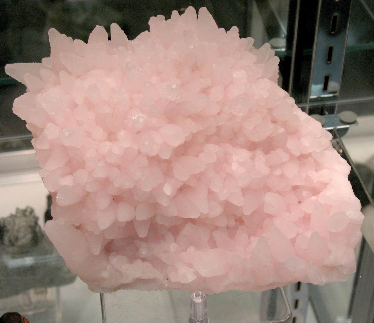 Pink manganocalcite forms in pointy crystal clusters such as this. It's composition is part-way between calcite (calcium carbonate) and rhodochrosite (manganese carbonate). Many nice specimens such as this were extracted from the Idarado Mine back when it operated. The Idarado Mine was on Red Mt. Pass between Silverton and Ouray, but tunnels ran for miles underground to as far as Telluride. The Idarado also produced fine white and clear quartz clusters, calcite specimens, sulfide minerals, and of course gold, including fine gold in quartz slabs. Manganocalcite has been more recently mined in Peru. |