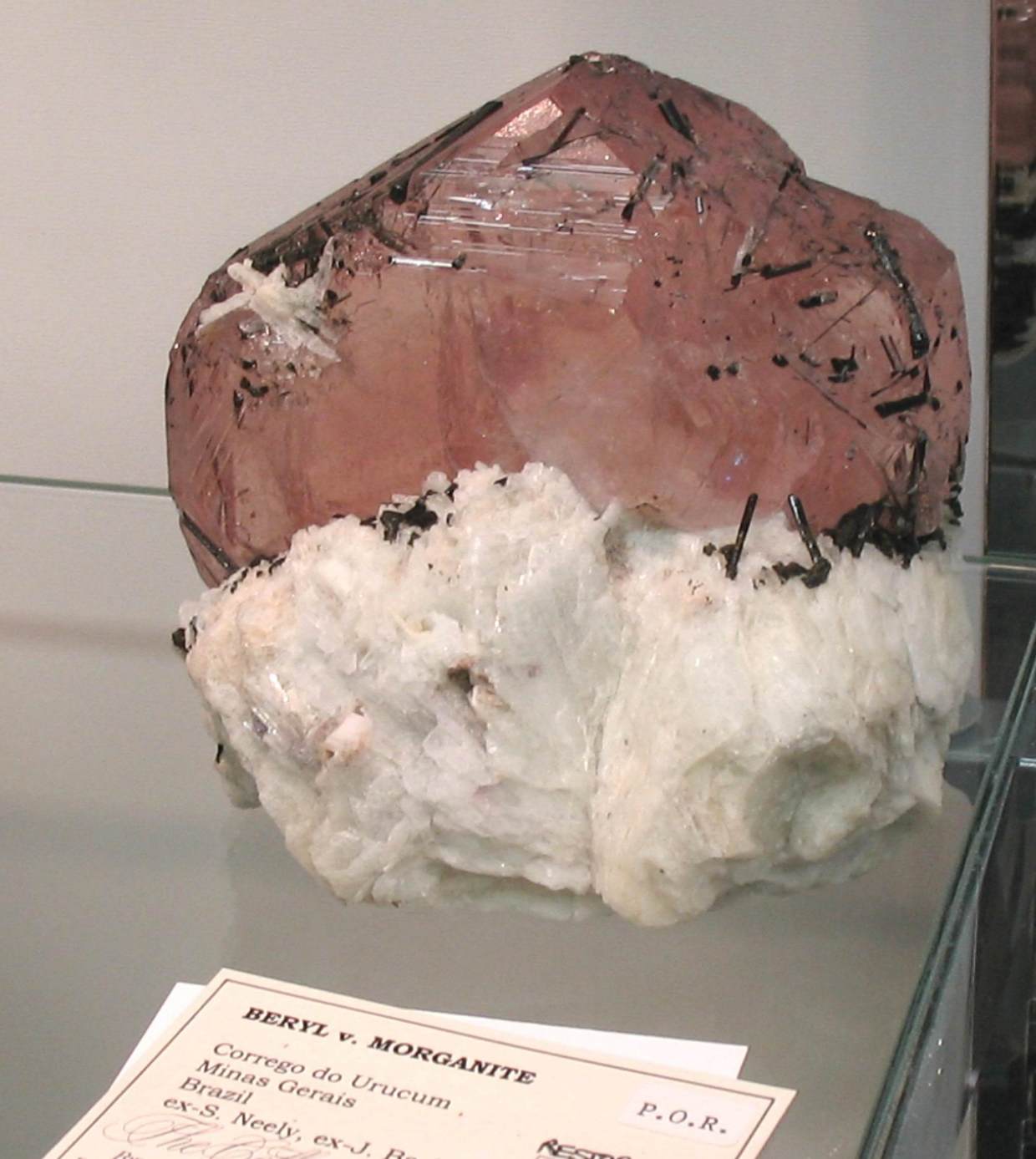 Gem quality pink or peach beryl, or morganite, often occurs in granite pegmatites along with tourmalines (there are green tourmalines along the edge of this crystal) and other gems. Brazil is the largest producer, but lately Afghanistan has been finding a large amount, with some also coming from Mozambique. California and Maine have produced minor amounts. The crystals are usually tabular instead of elongated like most beryls (aquamarine, heliodor, emerald, etc.). Some crystals have been recently recovered from several localities that are bi-colored, usually with a peachy morganite core and blue outer layer (aquamarine). The peach color can be driven to pure pink with gentle heat or sometimes even exposure to sunlight over time. |