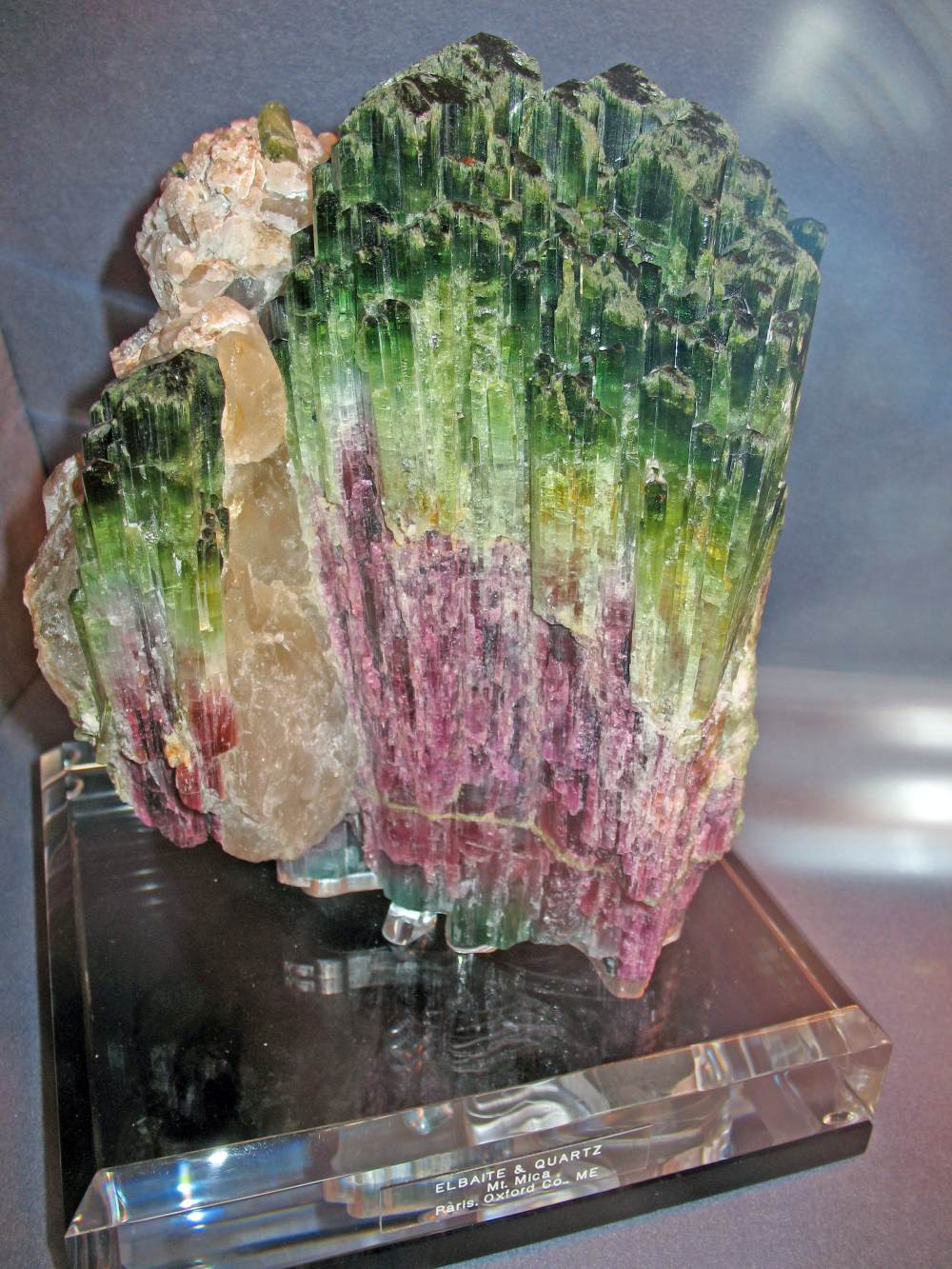 This large watermelon tourmaline was mined around 2006 at Mt. Mica, Oxford County, Maine. Mt. Mica is the oldest gem mine in the U.S.A. It was discovered in the early 1800's by the Hamlin brothers, and was developed and operated sporadically since that time. Maine is famous for quality tourmaline, not so much large quantities, but this mine and the Plumbago Gem Pit at Newry have produced the most. Other gems such as morganite, rose quartz crystals, and rarities too numerous to mention occur there as well in small concentration. Collectors can sometimes arrange to glean through the dumps of these mines during summer months, but usually the opportunities are limited. |