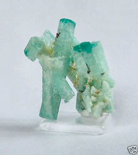 A cool cluster of light emerald crystals from Hiddenite, North Carolina. This area has produced the only long-term reliable source for emerald in North America. Still, the quality and quantity are far less than Columbia, Brazil, and several countries in Africa, as well as Pakistan. |