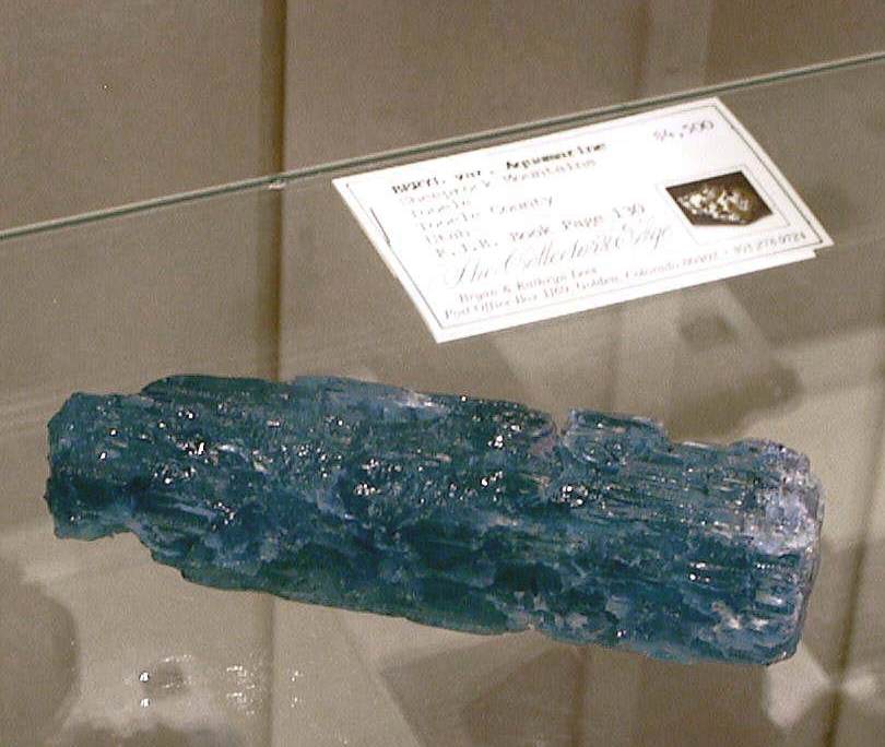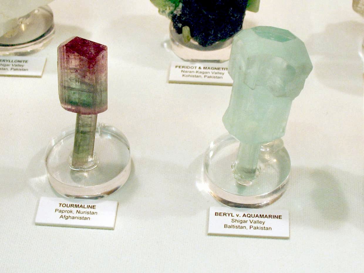Two unusual and interesting sceptered crystals on display at a recent Denver gem show. The crystal on the left is a sceptered watermelon tourmaline, from Afghanistan the one on the right a sceptered aquamarine from Pakistan. |