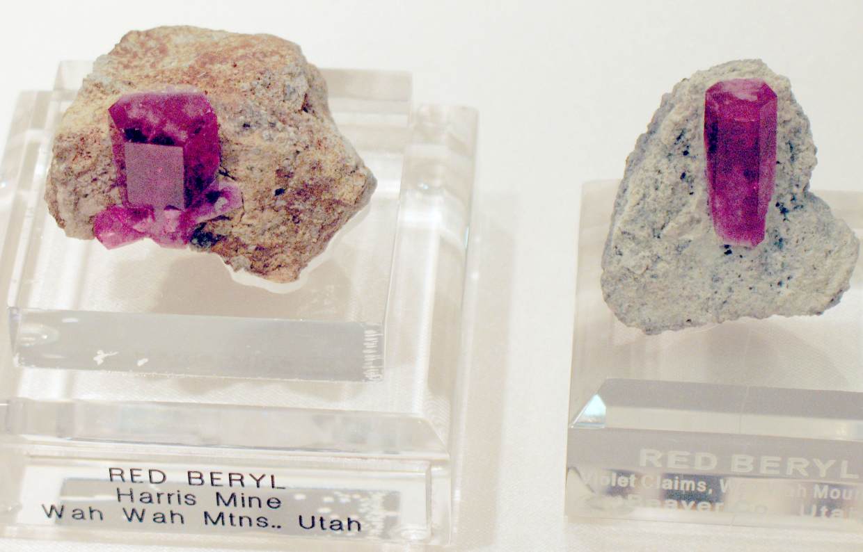 Red beryl, or bixbite, one of the rarest gems in the world. Most of the gem material comes from the Violet Claims in the Wah Wah Mts. of western Utah. Several other collecting areas have smaller red beryls, but they tend to be more orangish-red and are seldom gem quality. The crystals formed in a volcanic rhyolite matrix. |