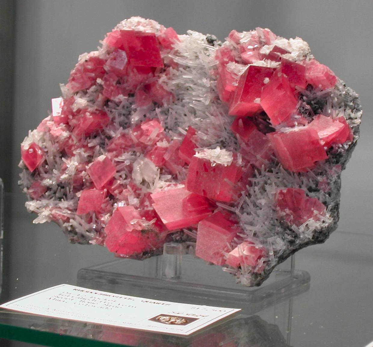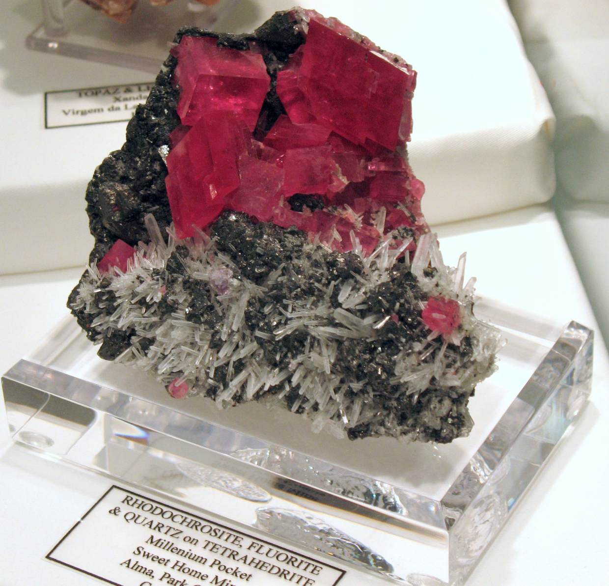 A real fine plate of gemmy rhodochrosite crystals on a needle quartz matrix from the world-famous Sweethome Mine, Alma, Colorado. This old silver mine was reopened and actively mined for world-class mineral specimens for about 10 years, starting around 1994. Bryan Lees of Collector's Edge Minerals in Golden, CO was the owner and operator. Specimens from this productive era are in museums and private collections all over the world. The fascinating story of it's history has been well documented in mineral magazines, books, and even on DVD. Regrettably, decreased production and increased mining costs led to it's closure in 2004. |