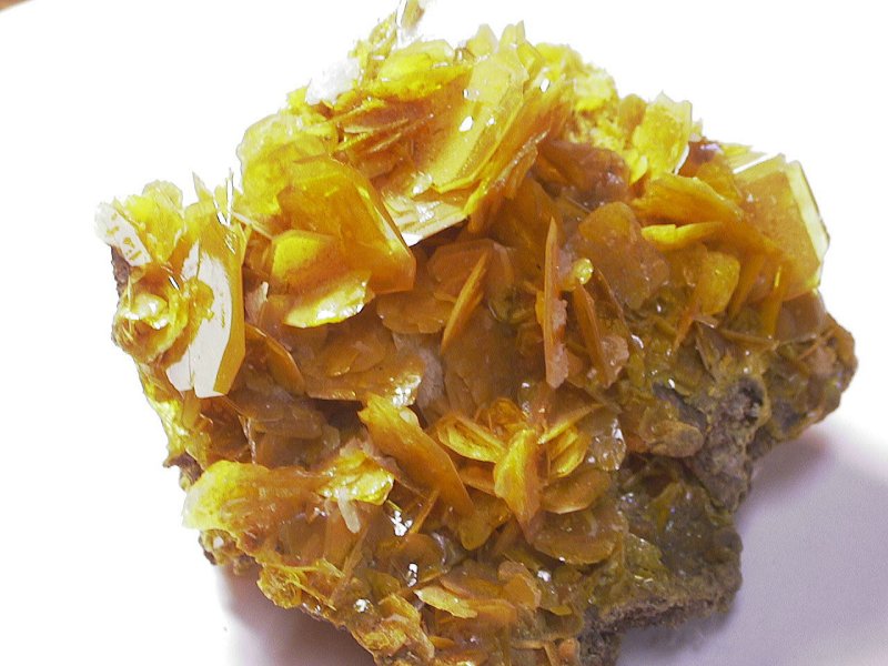 A fine golden yellow wulfenite from the San Francisco Mine, Cerro Prieto, Sonora, Mexico. These are very beautiful, but extremely delicate due to the thinness of the bladed wulfenites. These specimens came out around the early 1990's. Wulfenite is a lead-molybdenite mineral and is often found in the mines of Arizona and old Mexico and the desert areas around them. The USA has also produced minor wulfenite from New Mexico and back East at a few isolated mines. Wulfenite is popular with collectors due to it's colors and esthetics in spite of its delicate nature. Spomer collection. |