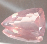 SOLD. White Elephant Mine, Pringle, SD. The White Elephant Mine produced quantities of fine rose quartz and large black tourmaline sheaves at one time, but is pretty picked over by now. This is the larger of two gems cut from one piece, probably the largest rose quartz gem I ever cut from material I found in South Daktoa. Has several small veils, but overall very clean and attractive, not a lot of typical haze. Better than picture, rose quartz is tough to photograph accurately, even on a mirror. Cut corner triangle cardinal cut. 31.04 cts, and measures 22.5 mm. (Stock # RQPT-3104) $310. |