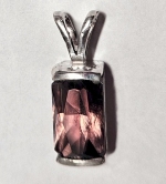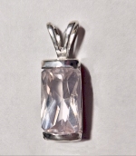 Always wanted a piece of jewelry with genuine Morganite? Here's a nice light pink 4.33 ct pulsar cut clean gem, set in a sterling "rabbit ears" pendant, ready for your chain. Dimensions of the stone are 7.5 x 13.6 mm. I cut the gem, but the rough came from Brazil. Morganite is the delicate pink variety of beryl, closely related to emerald, aquamarine, heliodor, goshenite, and red beryl. The only difference in them is the color, caused by tiny amounts of manganese, iron, chromium, and so on. Material is harder to get than it used to be. (Stock #PSSmorg0433). $170.00 |