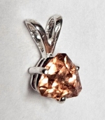Rare Mahogany Tourmaline gem from Mozambique,, fancy pulsar cut, set in sterling "rabbit ears" tourmaline mount, ready for your chain. This stone is an unusual color for tourmaline. Approx. 12 x 7 mm (stone size), 22 mm long pendant. Stone weighs over 4 carats, and is clean. (Stock #PSSMahoganyT0414) $220.00 |