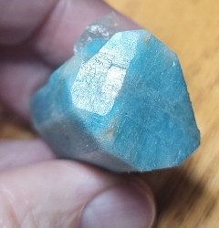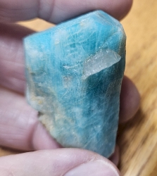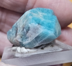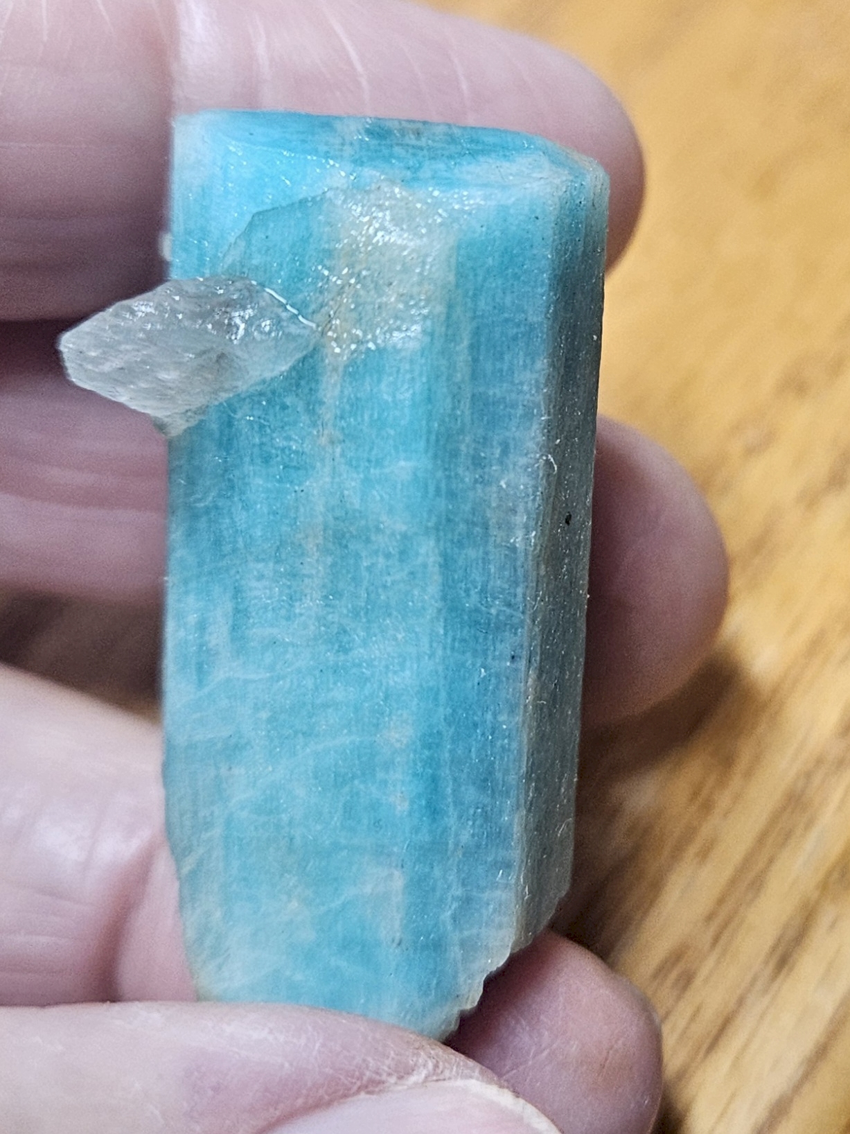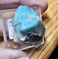 SOLD. Amazonite eudhedral crystal from the Blue Heaven Claim, Crystal Peak, Lake George, CO. ~1-1/8"x 1"x3/4". With a little sidecar of smoky