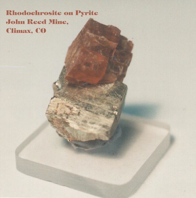 A dump collected specimen of pyrite and rhodo from the John Reed Mine, near Climax, CO. Found by Frank Knaus. Spomer collection. |
