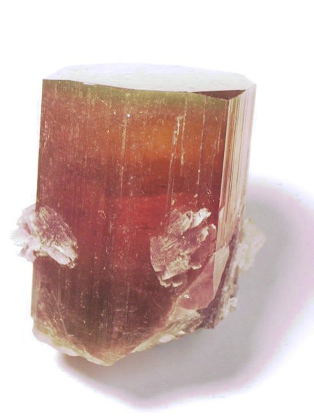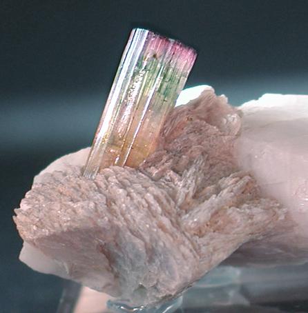 A multicolor crystal from the Himalaya Mine. Although this xl is not super gemmy, it is exceptionally lustrous. Note the attached clevelandite and lepidolite. |
