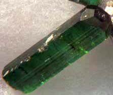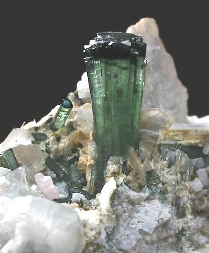 Here is another of Sarah's excellent tourmalines, also from Elba. This one she refers to as "il Re" (the King). She says it has unusual bright green color. Around the base are smaller blue-capped elbaites and morganite. The crystal measures 2.1x0.9 cm. Sarah Sudcowsky collection, Italy. Used by permission. |