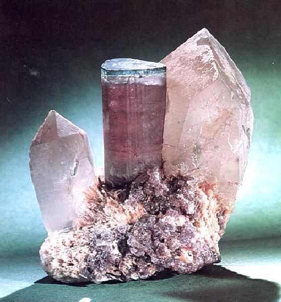 A great specimen of bi-color tourmaline on quartz and pegmatite matrix from the Tourmaline Queen Mine, Pala, CA. This was used as the model for the tourmaline postage stamp a number of years back. |