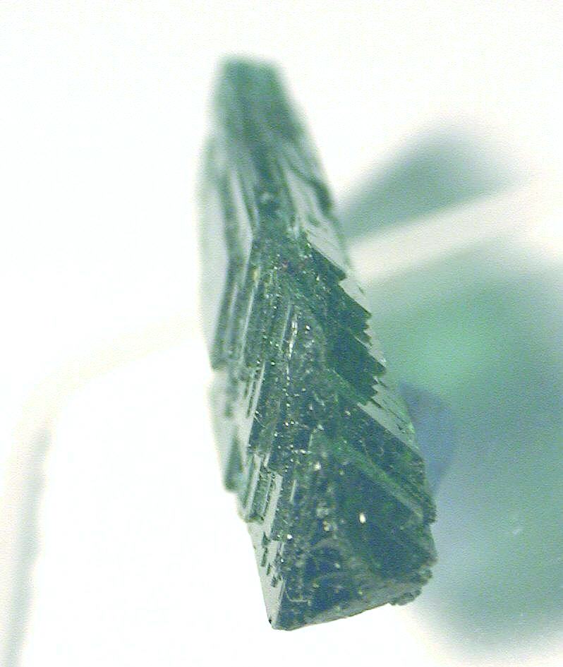 The termination end of a "gem" schorl xl from the Fano Mine, Riverside Co., CA. Note the multiple xl growth and pedion termination. Most schorls are "frozen" in the pegmatite and are heavily fractured, making it difficult to obtain good specimens. This schorl actually formed in a pocket and is probably a cross between schorl and elbaite, but appears jet black. |