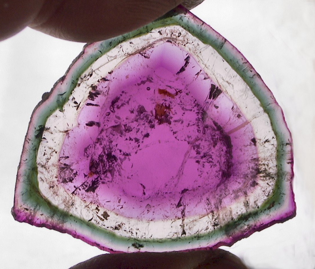 This is what a "watermelon" tourmaline looks like sliced across the crystal and polished. This superb piece came from the Otjuwa Mine in Namibia, Africa. |